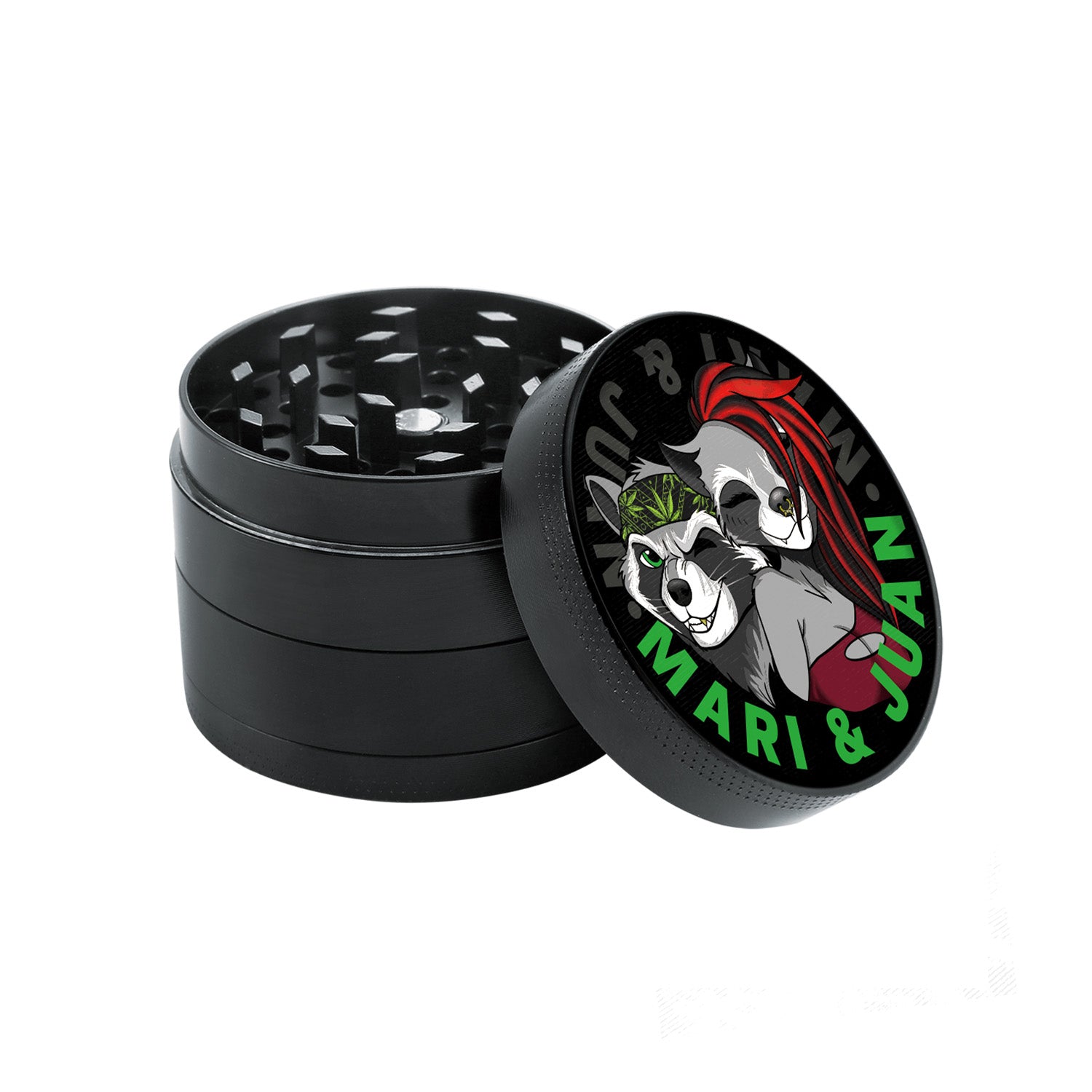 - 🦝 Elegantes Design: Mit dem Bild von Mari & Juan für eine ansprechende Optik. Der Grinder Metall ist ideal für stilbewusste Kräuterliebhaber